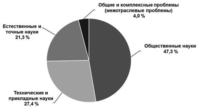 Характерно определение пропорций отраслей наук, получающих финансирование по зарубежным грантам. Следовало бы ожидать, что это должны быть технические или естественные науки. Авторитет России по этим направлениям в мире ещё достаточно высокий, чего не скажешь о российской гуманитаристике. Но преимущественное финансирование из-за рубежа получают именно общественные науки. Представителей точных наук предпочитают приглашать на работу за рубеж, нежели инвестировать через них российские научные инфраструктуры. Преимущественное финансирование по зарубежным грантам общественных наук в России объясняется опять-таки идеологическими, а через них и геополитическими обстоятельствами (рис. 23)[48].