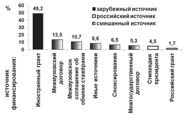 Наряду с грантами традиционным каналом «вербовки» элит всегда являлись иностранные стажировки. Этот механизм был активно применён в период, непосредственно предшествующий распаду СССР. В конце 1980-х гг. открылись «шлюзы», и многие будущие флагманы российской политики и науки, направленные стажироваться на Запад, оказались в обойме пропагандистской обработки. Изменилась ли принципиально ситуация сегодня? Статистика показывает, что зарубежные стажировки финансируются преимущественно из зарубежных же источников. Интересантом стажирования представителей нынешних и будущих элит России за рубежом выступает Запад. Ответ на вопрос, зачем ему это нужно, очевиден (рис. 24) [49].