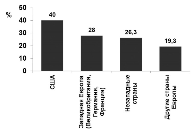 Характерно распределение по регионам мира доли российских стажёров, поддерживающих отношения с центрами стажировки после её завершения. Определённо лидирует в этом отношении США, несмотря на те объективные трудности, которые связаны с удалённостью Соединенных Штатов от России в сравнении со странами Европы. Значит, американские центры стажирования представителей российской элиты проявляют большую заинтересованность в сохранении соответствующих коммуникаций (рис. 25)[50].