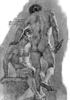 В известном рисунке «Группа из двух натурщиков» (рис. 9) Карл Брюллов использовал сложное сочетание материалов: сангины, пастели, угля и мела. Этим он добился богатства тоновых оттенков и цветовых нюансов.