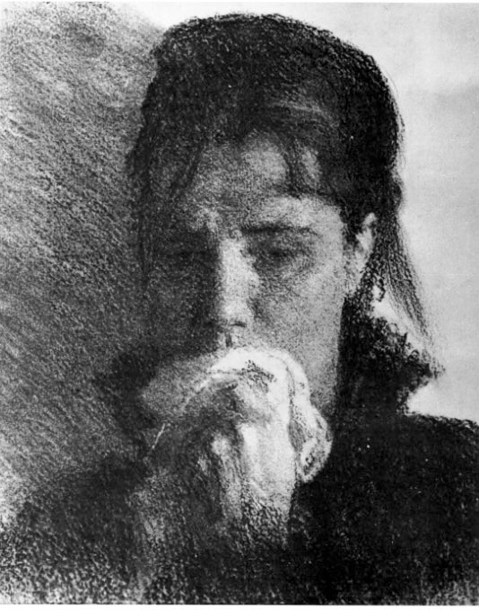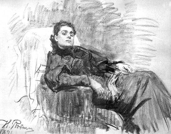 Илья Репин любил выполнять остропсихологические рисунки графитным карандашом и использовать в них растушку. Из рисунков углём на холсте интересен «Портрет Элеоноры Дузе» (рис. 13). Репин применил в нем разнообразные технические приёмы: то уголь кладётся плашмя, особенно при изображении одежды и фона, и слегка растирается, то работа ведётся свободным, широким штрихом. Репин очень умело передаёт фактуру платья, кресла, волос с помощью угля и шероховатой поверхности холста.