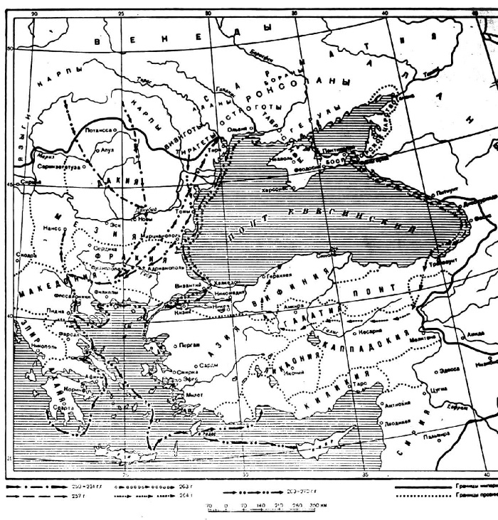 263 г. – поход готов вдоль западного побережья Черного моря, переправа с Балкан в Малую Азию, разрушение Халкедона, Трои, разграбление Эфеса, переправа обратно во Фракию и ее разграбление; возвращение домой[32].