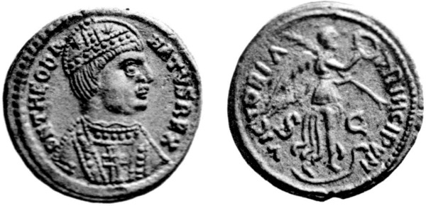 Бронзовая монета достоинством 40 нуммов короля Теодахада,отчеканенная в 536 г. в Риме. Аверс: бюст короля в короне с двумя звездами, платье с ожерельем и крестом, реверс: Виктория с пальмовой ветвью.