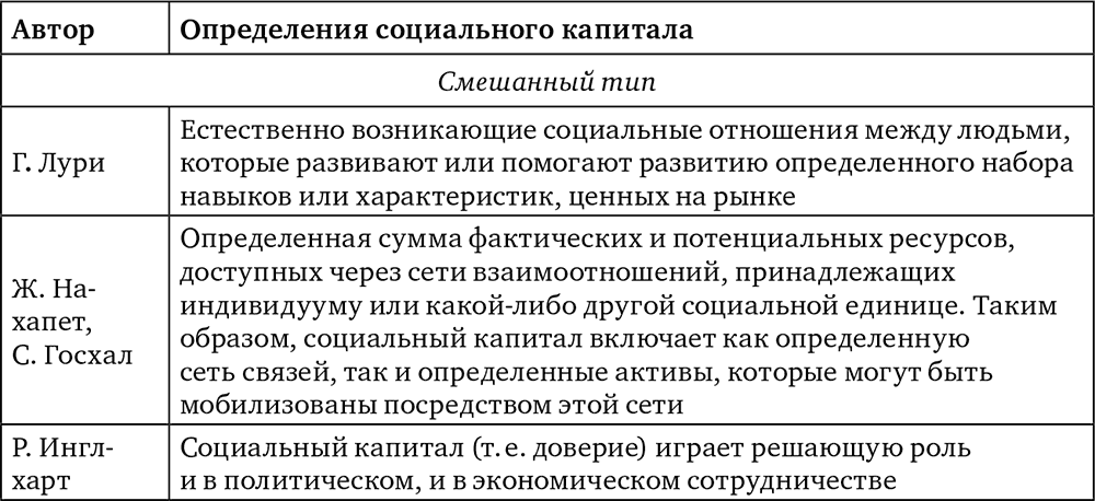 С опорой на источники формирования социального капитала на микро-, мезо- и макроуровнях выделяются три направления анализа его феноменологии (Стрельникова, 2003). Сторонники первого направления рассматривают социальный капитал как ресурс, упрощающий отношения отдельно взятого индивида внутри социальной сети (микро- и мезоуровни). Для представителей второго направления социальный капитал – ресурс, способствующий вертикальной мобильности индивида (социальный капитал, действующий на мезоуровне). Третье направление объединяет два первых, социальный капитал рассматривается как источник экономического роста, возникающий за счет формирования специфической локальной институциональной среды (социальный капитал, действующий на макроуровне) (Стрельникова, 2003, с. 36). В соответствии с тремя указанными направлениями в таблице 1 систематизирован ряд существующих на настоящий момент определений социального капитала.