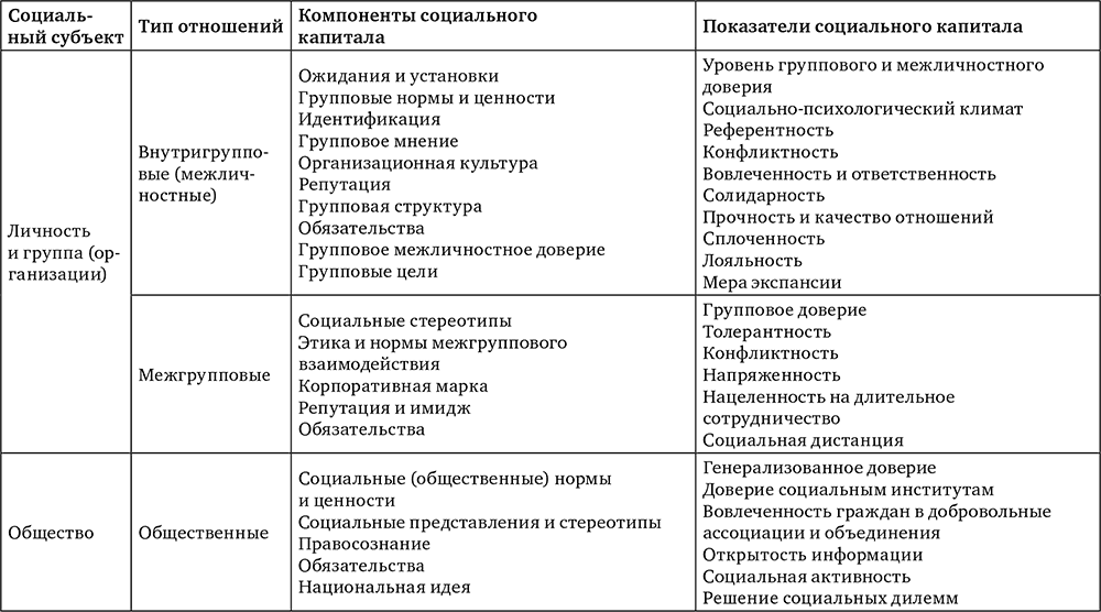 Обобщение всех типов отношений, показателей и компонентов социального капитала с психологической точки зрения можно найти в работе А. Л. Свенцицкого с соавт. (см. таблицу 2).