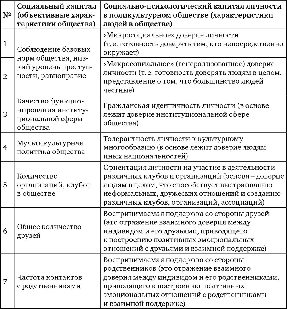 Таблица 4. Соотношение составляющих социального капитала и социально-психологического капитала личности в поликультурном обществе