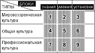В данной типологии Л.А. Зеленов [118] получил модусы, единицы (развернутые типы) культуры, каждая из которых содержит в себе три блока (знания, умения, установки), в совокупности порождая основные педагогические задачи. Реализация этих задач формирует готовую к деятельности личность. Представленная матрица освоения девяти блоков есть условие готовности человека к деятельности и к жизни в обществе в целом. В ней заложен набор критериев готовности личности: готовность к деятельности на основании сформированных знаний, умений, установок в девяти культурных планах.