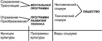 Здесь сохранение и трансляция относятся к ментальной ветке культуры (человеческий социум), отражение и преобразование – к научно-технической ветке (технический социум).