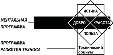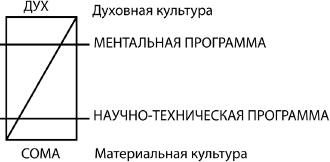Отметим ключевую закономерность: ментальная программа формирует установки, базируется на образах, а потому требует минимальной материализации. Программа, создающая вторую природу, наоборот, максимально материальна и формирует жизнь общества через знания и нормы деятельности: