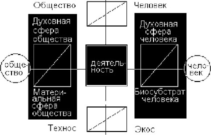 Вещный потенциал и идеальный потенциал культуры образуют все компоненты деятельности. Это – субъект, объект, средства, результат, система, условия, процесс, среда [10, с. 114]. Деятельность связывает человека и общество в качестве динамического ядра [118, с. 6–14].