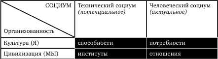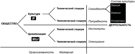Культура в данном ракурсе предстает как совокупность социальных образований. Формируется сфера деятельности, в которой человеку принадлежат потенциал способностей и его актуальные потребности, а обществу – отношения и институты.