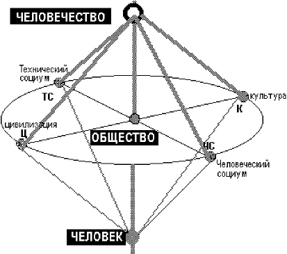 Середину иерархии мы трактуем как «общество», обычно придавая ему оттенок: «цивилизованное». Но в таком случае более ранние социумы (род, племя и т. д.) мы должны представить становящимися состояниями общества, а современные неклассические образования (Объединенная Европа, транснациональные организации, ООН) – новым состоянием, модификацией социума на переходе от классического «общества» к «человечеству». Отсюда – важный вывод: «общество» масштабно движется в пространстве от человека до человечества. Это – факт его истории.