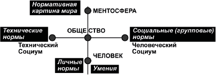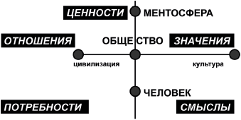 Такая, вполне убедительная, гипотеза для нас очень важна. Она дает основание разделить культуру на подсистемную «культуру личности», управляющую непосредственно человеком (через готовность к деятельности, через культурное поведение человека в обществе), и на системную «культуру общества», управляющую поведением устойчивых человеческих общностей. Программу этой, второй, культуры содержит и определяет сверху менталитет, откуда к человеку приходят цели и ценности. Снова мы говорим о трех уровнях: о человечестве (менталитет), об обществе (культура общества), о человеке (культура личности).