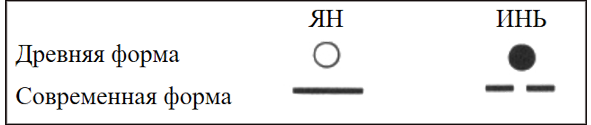 В более ранних писаниях Ян обычно изображался белым диском, а Инь – черным; однако позже первый символ стал изображаться длинной чертой, обозначающей силу, а второй – прерывистой линией, символизирующей слабость. Тем не менее, диски по-прежнему использовались в диаграммах – как, например, в «Карте Хо» или «Таблице Ло» – хотя более поздний метод для изображения комбинаций куа начал повсеместно применяться еще до Конфуция.