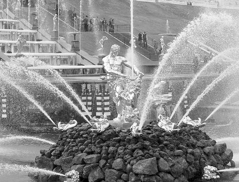 Самый роскошный пригородный дворцово-парковый ансамбль – Петергоф – Петр I заложил в начале XVIII в., возможно, под впечатлением от Версаля с каскадами Марли. Здесь был создан Дворцовый парк, состоящий из Нижнего парка с дворцами-павильонами Марли, Монплезир и Эрмитаж, а также Верхнего парка с роскошным Большим дворцом, построенным Растрелли. Перепад высот между дворцом и берегом Финского залива, составляющий 40 м, был использован для создания Большого каскада – великолепного сочетания архитектуры, скульптуры, фонтанных струй и садового искусства. Центром композиции служит исполинская фигура Самсона, раздирающего пасть льва, вырывающиеся из которой Самсон, раздирающий пасть льва водяные струи поднимаются на высоту 20 м. Вокруг ковша-бассейна и над ним, на уступах каскадов бьют фонтанные струи и поднимаются золоченые копии античных скульптур. Этот дворцово-парковый ансамбль занимает площадь около 1 тыс. га и включает в себя несколько парков и около 20 дворцов и павильонов.