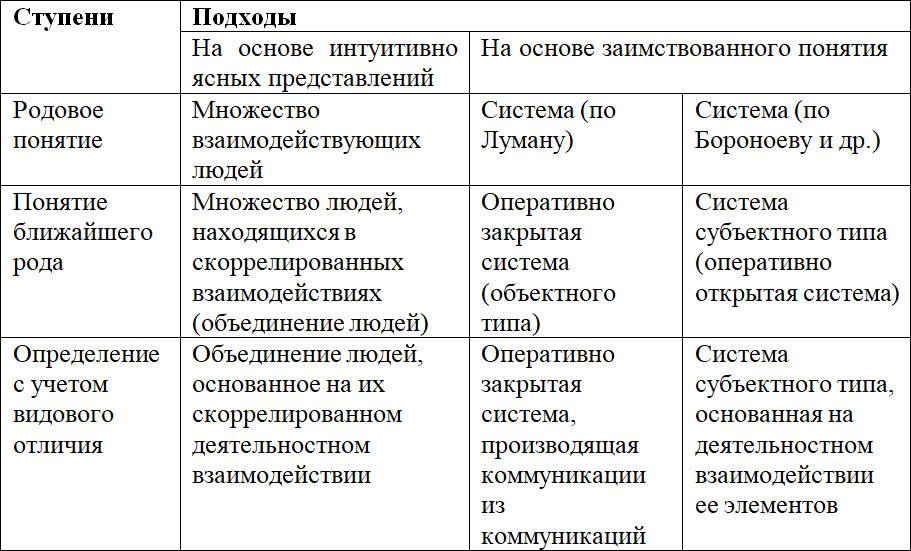 В третьей и четвертой колонках в качестве родового понятия используется общенаучное понятие «система». Ближайшим родом оказываются соответственно системы объектного или субъектного типов. Предположительно, видовыми отличиями, позволяющими определить место общества в узком смысле слова среди других видов – объединений людей или систем субъектного типа – оказываются: а) коммуникационное взаимодействие, связанное с передачей информации, и б) деятельностное взаимодействие.