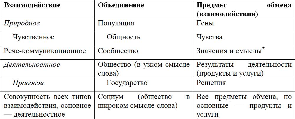 В таблице указан тип взаимодействия, являющийся видовым отличием данного объединения людей. Его специфику определяет предмет обмена.