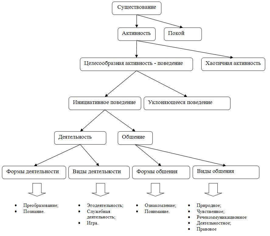 Одна из проблем познания деятельности состоит в том, что в настоящее время категории, отражающие различные проявления человеческой активности, например, такие, как «жизнедеятельность», «поведение», «деятельность», «общение» в научной литературе не соотнесены между собой. Они употребляются в обществоведении и науках о человеческом поведении либо как интуитивно ясные, либо метафорически поясняются друг через друга.