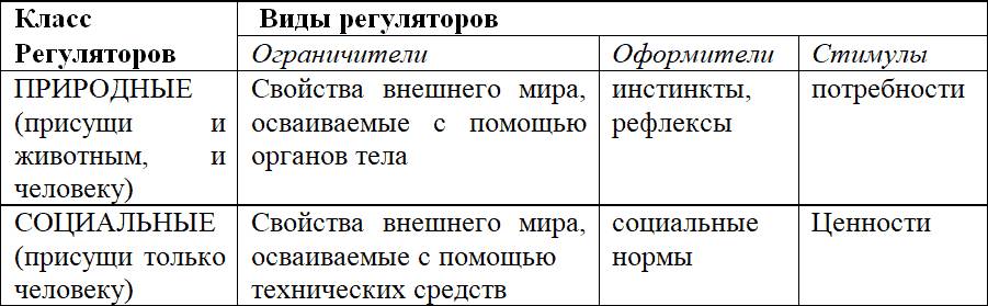 Виды регуляторов можно условно разделить на два класса: природные и социальные. Назовем природными регуляторами те, что свойственны и человеку, и животным, а социальными те, что свойственны только человеку (см. Табл. 3).