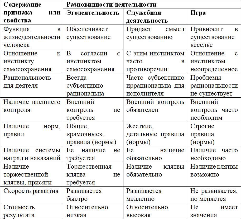 Во второй содержательной строке таблицы дано соотношение разновидностей деятельности и инстинкта самосохранения. Очевидно, что эгодеятельность находится с ним в согласии, ибо этот инстинкт также направлен на обеспечение существование. Понятно также, что служебная деятельность часто находится с ним в противоречии. Служение имеет своей целью существование некоего «другого» и требует от деятеля самоумаления, вплоть до самопожертвования. Что касается игры, то ее отношение к инстинкту самосохранения является неопределенным, ибо игра иногда принимает форму состязания, проигрыш в котором влечет смерть [Хейзинга, 1992, с. 87–92 и др.].