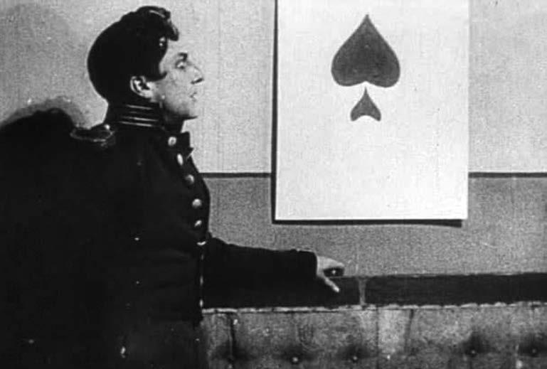 В «Пиковой даме» изысканная, покрытая флером тайны и до сих пор не разгаданная история «трех карт» весьма упростилась, но зато приобрела актуальный для своего времени смысл: неудачник Германн превратился у Мозжухина в полубезумного искателя денег, состояния. Демоничный, с резким орлиным профилем, с огромными и словно бы остекленевшими глазами под черными дугами бровей герой фатально приближался к краху: последние кадры фильма показывали его на койке сумасшедшего дома, маниакально тасующим колоду карт и всякий раз вместо заветного туза («тройка, семерка, туз» – как сообщила графиня) вытягивающим даму пик – символ расплаты за смерть старухи.