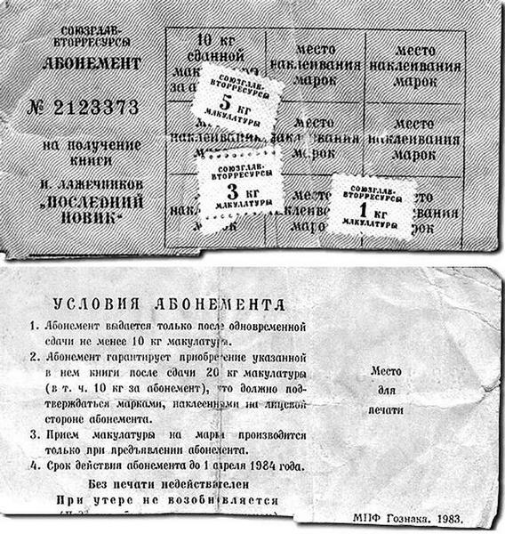 Чиновники слегка «зачесали репу», когда выяснилось, что талоны, напечатанные в некоем соответствии с предполагаемым тиражом «Королевы», кончились, а горы макулатуры всё росли и росли. Тогда было всенародно объявлено, что планируется ещё выпуск большинства шедевров Дюма и других, не менее великих писателей – список прилагался. Это подстегнуло народные массы к новым ухищрениям и разного рода хищениям. Тысячи и тысячи учреждений, доселе ежегодно и планово избавлявшиеся от накопившегося архивного хлама, перестали выполнять этот государственный план – многие тысячи тонн некогда «ценных бумаг» ушли за талоны, которые, к слову, были приравнены к ценным бумагам, имея на аверсе номера, как на денежных знаках, а на реверсе – устрашающую надпись: «Подделка абонемента карается законом». (На данном абонементе 1983-го года, к сожалению, эта фраза оказалась срезанной, можно разглядеть лишь верхушки букв «П» и «б» и «хвостики» скобок). Тысячи и тысячи библиотек по всему необъятному Союзу провели учёт и переучёт своих фондов и избавились от обветшавших книг, основную массу которых составляли нечитанные труды классиков марксизма и всевозможные материалы по съездам КПСС. И всё это несметное богатство было брошено под ноги «Королевы»! Государство взвыло. В срочном порядке были запрещены к приему книги с библиотечными штампами и в твёрдых переплётах, газеты и журналы в подшивках, архивные и другие папки, имеющие металлические скоросшиватели. Приёмщикам макулатуры было велено строго соблюдать новые правила приёма, что позволяло им ещё больше куражиться над гражданами, которым они и ранее, как правило, не платили определённые государством 2 коп. за 1 кг. Как думаете – помогло такое усиление контроля? Из продуктовых магазинов практически исчезла всяческая «завёрточная» бумага (полиэтилена тогда ещё не было), на афишных щитах и тумбах месяцами не обновлялась реклама, а во множестве всевозможных НИИ тоннами бесследно исчезали перфокарты для ЭВМ – «бабушек» нынешнего компьютера.