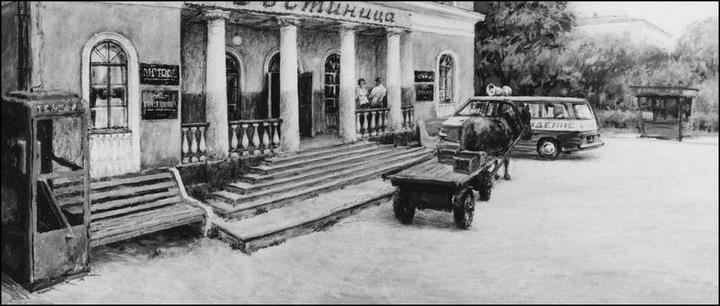 Там, по задумке, герои, переночевав в «Доме колхозника», отправляются из своего полутёмного, но ясного прошлого в светлое, но туманное будущее. Я обнаружил в одном из углов центральной площади (с названием площади могу наврать, но памятник там чудом сохранился) очень замызганный вход в какую-то контору, а рядом – арку-подворотню. Из этого-то угла я и вознамерился сделать объект. Беда была в том, что «полутёмное прошлое» почти весь день освещалось солнцем, а «светлое будущее» было достаточно тёмным из-за деревьев, растущих за аркой. Но отступать было некуда, за нами – как обычно – Москва. Пришлось пошить несколько больших чёрных полотнищ и натянуть их, тем самым пригасив освещение над всем объектом. А до того я по несколько раз в день заезжал на площадь и отмечал по часам время наиболее яркого освещения пространства за аркой. Сейчас с завистью к самому себе – прежнему – вспоминаются времена, когда художник мог выгадывать состояние освещения, а потом назначать время съёмок! Ныне про такие «капризы» все давно забыли – «лудят» когда ни попадя. А тогда на один такой коротенький кадр – вышли мужики из двери и куда-то пошли – не жалелось ни сил, ни времени. И задолго до съёмок был, естественно, выбор натуры и время на написание эскизов. В этом эскизе я практически (почти с натуры) нарисовал всё, как там было. Добавил только, конечно же, вывеску и другие мелочи, придумал лужу, как очень характерную деталь нашей провинции, «притащил» остов ржавого автомобиля, как некий образ безысходности, «повесил» вечно горящую лампочку и «приподнял» статус захолустья дурацкими, грязными рекламными стендами о пользе мяса кроликов и «птицы». Эскиз получился настолько убедительным, что ни у кого не возникло и тени сомнения в необходимости этого объекта именно в таком виде. Хочется похвалиться, что Вадим Юсупович Абдрашитов забрал в экспедицию несколько эскизов и расставил их у себя в гостиничном номере, надеюсь, для душевного настроя. А наш любимый оператор Владимир Карлович Шевцик однажды поздним вечером, встретив меня в коридоре гостиницы, заволок к себе в номер со словами: «Надо посоветоваться». Оказалось, что он выпросил на время у Абдрашитова этот эскиз и внимательно его изучал.
