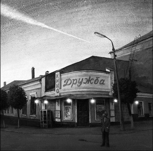 Не знаю, что подвигло меня на написание этого эскиза. В сценарии мельком было сказано, что герои, чтобы убить время, зашли в кинотеатр. И всё. На эскизе – реально существующий и поныне Серпуховской драмтеатр. Что мне тогда «мерещилось», не знаю, но приземлённость мерцающего в предрассветных сумерках странного здания и – контрапунктом – высокий, уже освещённый солнцем, инверсионный след самолёта… Что-то в этом было. Не знаю что, но было что-то щемящее… Я этого не видел. Я это придумал. Потом придумался какой-то ранний дворник, равнодушно делающий свою опостылевшую «приземлённую» работу… Дворник у меня никак не хотел мести этот гнусный асфальт, и, в конце концов, сам, почти без моего участия, бросил эту чёртову метлу. Я лишь помог ему одеться во что-то лётно-военное, явно с чужого плеча. И этот слегка опустившийся человек тупо воззрился в небо… Это я сейчас (тоже, кстати, на рассвете) так длинно и «красиво живописую», тогда же сделал эту картинку довольно быстро (за ночь) и, как помнится, не шибко задумываясь. И – что правда, то правда – слово «Дружба» возникло как-то само по себе на этом странном фронтоне и возымело здесь совершенно определённый смысл.