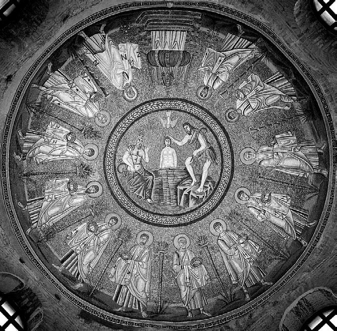 Рис. 39. Под центральной сценой крещения Иисуса (умирание для старой жизни и принятия новой) изображён престол уготованный – этимасия. В присутствии императора-Христа апостолы держат полами одежды венцы – награда за праведную веру (высшая награда в римской империи). На фоне райских, пальмовых кущ они славят величественный престол с киворием, он также и трон – знак Второго пришествия и воцарения Христа. На императорском троне лежит пурпурное седалище, на которое опирается драгоценный крест – символ Спасителя. Красная ткань, обнимающая крест, – это плат с главы Христа (Иоан. 20:7). Баптистерий Ариана, VI в. Италия, Равенна.