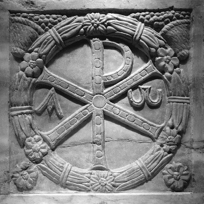 Рис. 40. Венец окружает монограмму Христа (Хризма – Хи-Ро, – монограмма имени Христа, состоящая из двух начальных греческих букв его имени: греч. ???????), на концах буквы X висят медальоны с буквами Альфа и Омега. Мрамор, IV в. Музей Ватикана. Италия, Рим.