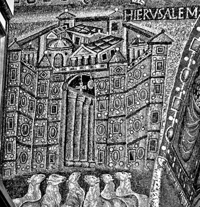 Рис. 43. Агнцы (символизирующие праведников, святых или мучеников) предстают у врат Небесного Иерусалима, изображённого как единое центрическое городское/храмовое пространство.