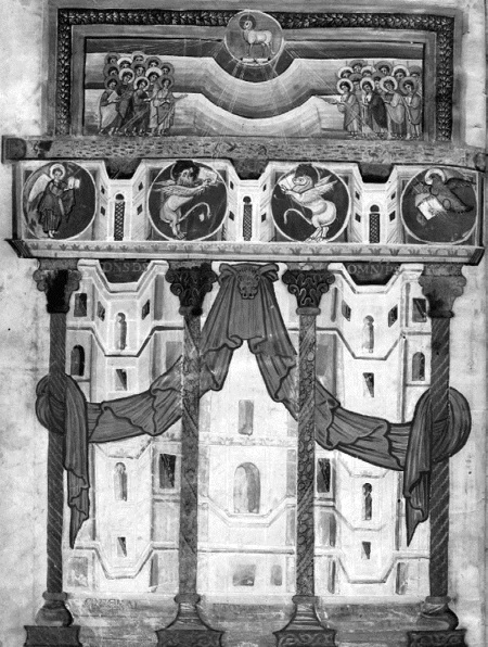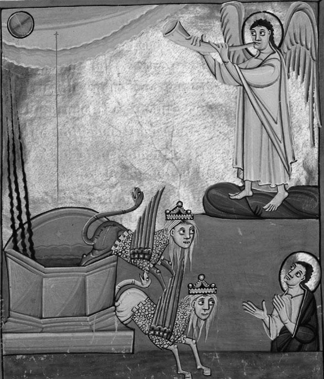 Конец X и начало XI вв. – страшное время в европейской истории. В период 980-1040 гг. казалось, будто сам ангел смерти распростёр свои крылья над миром людей: царил голод, мор ходил по Европе вдоль и поперёк, бушевала болезнь, названная огнём святого Антония – эрготизм, гангренозная болезнь конечностей, изжигавшая кости людей. Страдающие осаждали дороги, ведущие к святыням, в первую очередь, к реликвиям Св. Антония, наполняя церкви зловонием и духом смерти. Страсти этого недуга запечалятся на триптихе Иеронима Босха «Искушение Св. Антония». В результате кризиса гигиены и медицины, не справлявшейся с людским мором, около 40 тысяч человек стали жертвами чумы в регионе Аквитания в южной части Франции, чёрная смерть выкашивала огромные пространства Европы, затем пришёл голод. С 987 по 1060 гг. тянулся долгий период голода и эпидемий, началось вторжение венгров и вернулись ужасы Аттилы: венгры представляли иную антропологию и чуждую культуру, производя пугающее, устрашающее, жуткое впечатление на жителей Европы, чьи территории были опустошены. Рауль Глабер описывает сцены жуткого состояния упадка и бессилия людей, каннибализм. Исторические обстоятельства воспринимались как процесс начала апокалипсиса. Пропорционально популярности эсхатологических идей развивалась и образная традиция: с XI века всё больше создавалось рукописей на тему Откровения Иоанна. Возник обширный романский цикл Апокалипсисов, доминировавший в средневековой Европе в позднекаролингский период и до начала эпохи готики (IX–XIII вв.). Эти рукописи объединяет общий стиль величественных и больших по формату иллюстраций, их количество росло, рисунки детализировались, обретая экзегетическое значение. Образы романского цикла можно встретить не только на страницах манускриптов: настенные фрески, декор, церковная скульптура также формировались в русле одной парадигмы. Ранние предшественники романской традиции в рукописях – сцены Апокалипсиса из каролингских библий: Библии Мутье-Грандваль (Moutier-Grandval Bible, Тур, 830–840 гг.)38, Библия Вивиана (Vivian, Тур, 846 г.)39, Библия из Сан-Паоло-фуориле-Мура в Риме (Реймс, примерно 870 г.)40. Их фронтисписы демонстрируют Агнца и Льва, святой престол (Откр. 5), ангелов или изображение церкви, символизирующее послания (Откр. 2, 3).