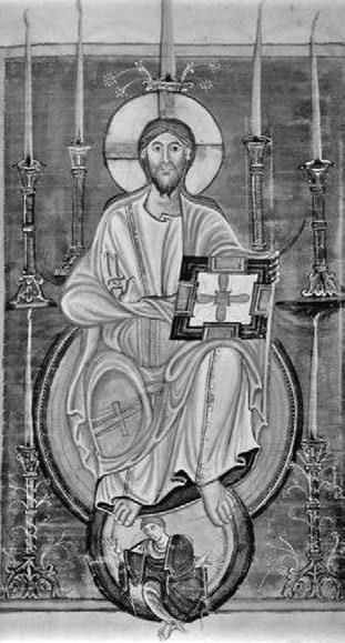 Устойчивая иконография Апокалипсиса зафиксирована во множестве манускриптов и монументальном искусстве «каролингского возрождения», влиявшего на художественный канон церквей Германии, Франции, Италии IX–XIII вв.28 Также встречаются единичные сцены из Апокалипсиса в иллюминированных рукописях29. Обычно они сводятся к изображению Сына Человеческого посреди семи подсвечников (1:12–20) и апокалиптически-декоративным инициале в романских библиях. Иногда изображался Христос в силах, сидящий на шаре (земном шаре или радуге с книгой в руках, окружённый мандорлой) как в «максиминовском» Евангелии XI века30 или Библии из Адмонта, демонстрирующей Христа из видения пророка Иезекииля31.