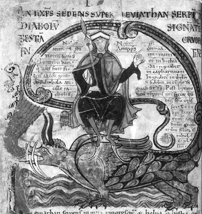Рис. 52. Царственно одетый Антихрист едет верхом на левиафане – часто встречающемся средневековом чудовище, персонификации хтонической мощи дьявола. Пророк Исаия предрекал: перед Концом света монстр вырвется из ущелья, но вновь будет повержен Богом (Ис. 27:1). Liber Floridus (XII в.). Ghent University Library. Ms. 92, fol. 62v.
