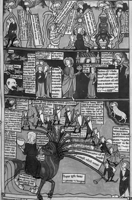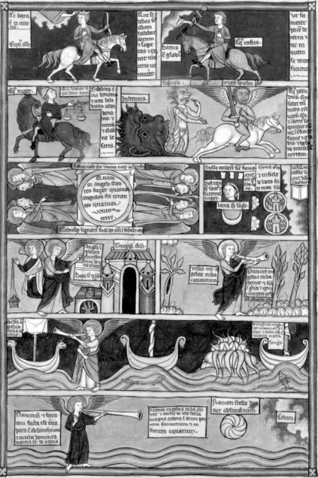 Рис. 55. Сверху: шестой ангел, благословлённый рукой Бога из золотого жертвенника, вострубил, освободив четырёх ангелов, связанных у реки Евфрат, они должны умертвить третью часть людей (Откр. 9:13–14). Посередине: кони с головами льва, пожирающие людей, бесовские всадники, умерщвляют людей (Откр. 9:17–19). Ниже: ангел с книгой в правой руке, одной ногой на земле, другой стоит на воде. Иоанну даётся свиток, огонь выходит из уст свидетелей (Откр. 10 и 11:1-13). Oxford. Bodleian Library. MS. Bodl. 352, fol. 8r.
