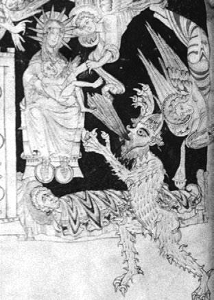 Уникален фронтиспис манускрипта «Града Божьего» Св. Августина, находящегося в Оксфорде (примерно 1130-40 гг.), изображающий под Градом Христа, сидящего на троне среди апостолов. Ниже и слева – христоподобный Архангел Михаил изгоняет копьём побеждённого сатану из Небесного града (Откр. 12:7–9), а справа изображена благодатная Церковь, представленная в образе Жены (Богородицы), одетой в солнце. В своих руках она держит, защищая, новокрещёные души, возрождённые из греха и неподвластные атакам сатаны, а старое тело только что крещённой души лежит подле (Рим. 6:22)50.