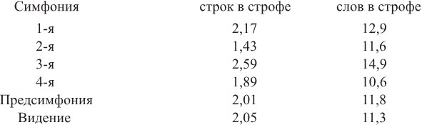 Необходимо еще раз заметить, что наиболее стабильным ритмообразующим средством всех четырех симфоний оказывается необычная для прозы версейность, упорядоченность строчного и словесного объема строф: