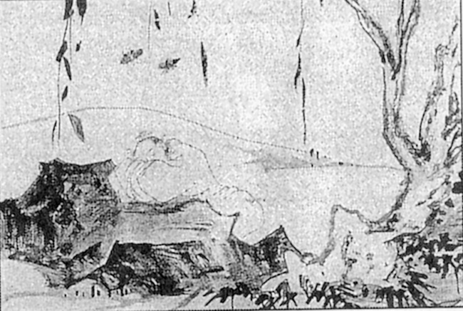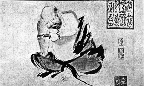 Бодхидхарма, переплывающий Янцзы на стебле тростника. Рисунок императора Шуньчжи. Середина XVII в.