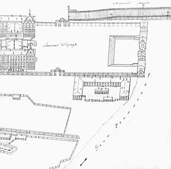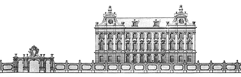 На углах стены предполагалось возвести небольшие павильоны-люстгаузы. Любопытно, что при всех последующих перестройках дворца число окон по фасадам дворца осталось неизменным.