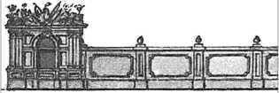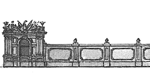 Левый угол ограды слюстгаузом, выходящий на Фонтанку («Маленькие люстгаузы по обеим сторонам стены»)