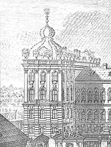 Аничков дворец. Левый ризалит с куполом. Фрагмент гравюры М.И. Махаева. 1753 г.