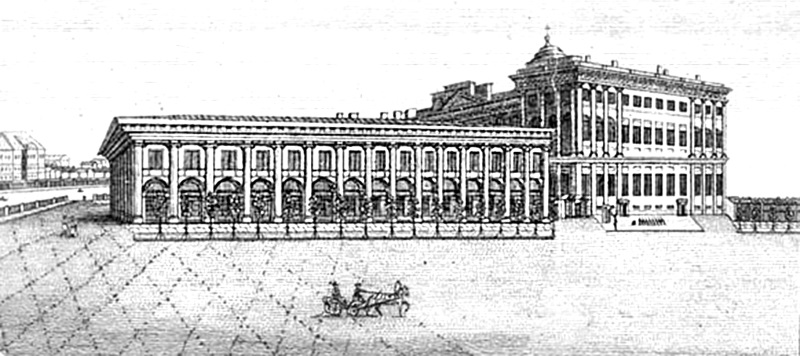 Нижний этаж здания предназначен был в старое время под торговые склады и со стороны Невского выходил открытыми аркадами, подобно Гостиному двору. Николай Степанович смело принялся за переделку произведения Гваренги; аркады были забраны, образовался светлый длинный коридор, к которому примыкали помещения контроля и кассы. Перестройку и переделку он старался произвести с экономией, находил время наблюдать даже за сушкой новых стен, сам подкладывал дрова во „времянкисс. Для украшения здания Николай Степанович заказал портреты в натуральную величину всех императоров и императриц. Портреты обошлись очень дешево, но зато и работа была низкопробная, исполнила заказ какая-то неизвестная художница»[51].