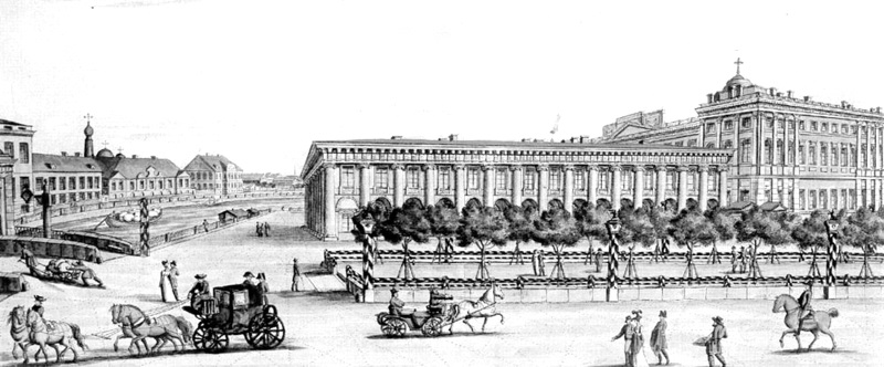 Следует заметить, что двор Аничкова дворца, выходящий на Фонтанку, после засыпки гаванца и разбора деревянной галереи отдали под склады лесных товаров, поначалу предполагая оградить его каменным забором. Потом предполагалось построить каменный корпус с магазинами внизу и жилым верхним этажом, что должно было не только украсить часть Невского проспекта у Аничкова моста, но и приносить некоторый доход – 20–25 тыс. руб. ежегодно. Смета по строительству здания предполагала траты в сумме 226 298 руб. Причем к 1803 г. почти половина этой суммы в распоряжении Кабинета уже имелась[47]. 10 января 1803 г. Александр I распорядился начать строительство здания Кабинета: «Быть по сему, а строение производить Гваренгию под собственным наблюдением управляющего Кабинетом». Причем из двух представленных проектов Александр I «изволил апробировать те планы, которые с колоннами, признавая их лучшими и более красоты зданию дать могущими»[48].