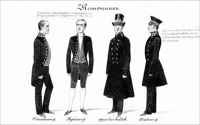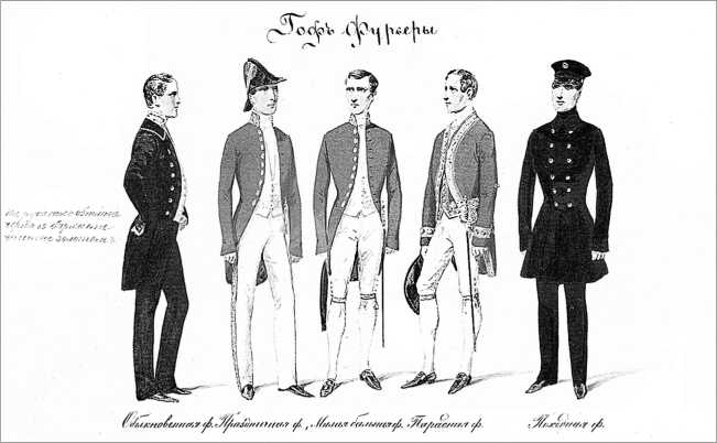 Придворный штат также определял круг различных специалистов, работавших на ответственных должностях в Аничковом дворце. Все они носили придворную форму, полагавшуюся им по статусу[261]. Требование ношения формы распространялось на всех служащих резиденции, включая самый низший персонал, так называемых «кухонных мужиков» (с 1832 г.)[262].