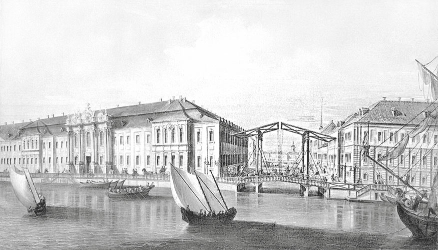Проспект Старого Зимнего дворца с каналом, соединяющим Мойку с Невой. Неизв. худ. по рис. М.И. Махаева. 1755–1760 гг. В центре виден подъемный мост через Зимнедомский канал, построенный по проекту ван Болеса. Слева от него – Зимний дворец Петра I (3-й Зимний дворец), справа – дом обер-гофмейстера Олсуфьева