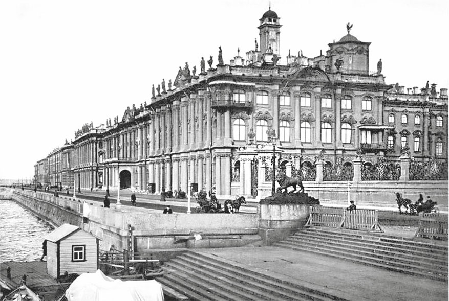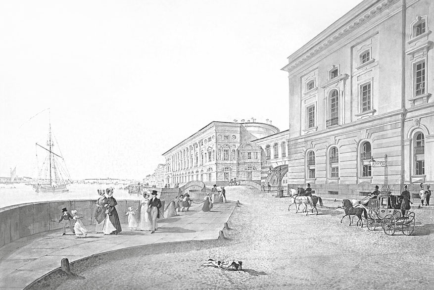 После наводнения набережную быстро привели в порядок. Мостовую замостили камнем. Вдоль парапета шла вымощенная гранитными плитами пешеходная дорожка, отделенная от проезжей части рядом масляных фонарей. У северо-западного угла Зимнего дворца имелся мощеный спуск к воде, аналогичный спуску, сохранившемуся до наших дней около Эрмитажного мостика.
