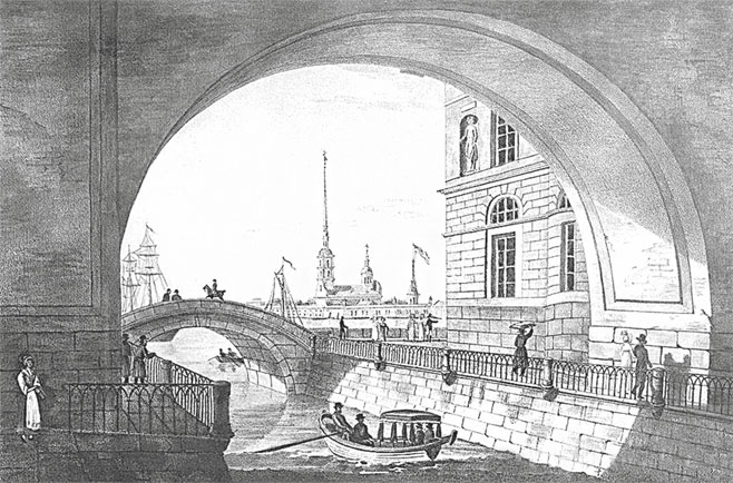 Вид на Эрмитажный мост со стороны Зимней канавки. Раскрашенная гравюра по рис. И. Урениуса. 1815 г.