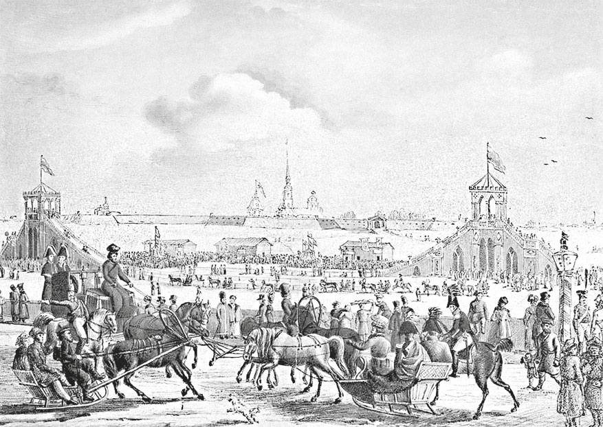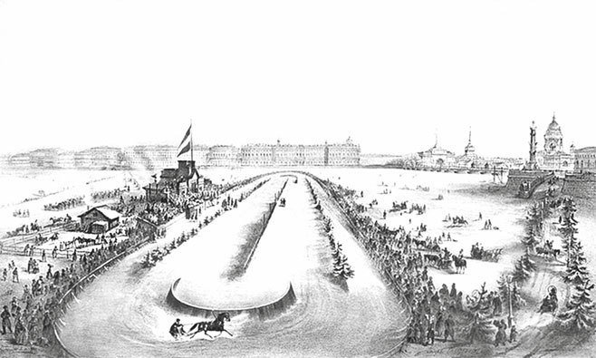 Напротив Зимнего дворца, в самом широком месте реки, устраивали снежный ипподром. До середины XIX в. на Неве на Рождественские праздники устраивались массовые гуляния. Прямо на льду строили катальные горы, деревянные и снежные дома, расчищали катки.