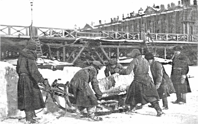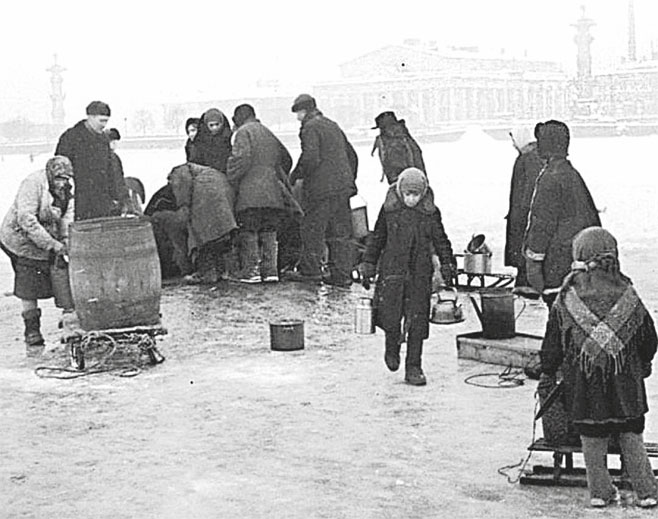 Вместо Крещенской проруби во льду Невы сделали прорубь, в которой жители осажденного города могли брать воду. А на набережной вместо гуляющих горожан можно было видеть колонны солдат, военных моряков и ополченцев, направляющихся на фронт.