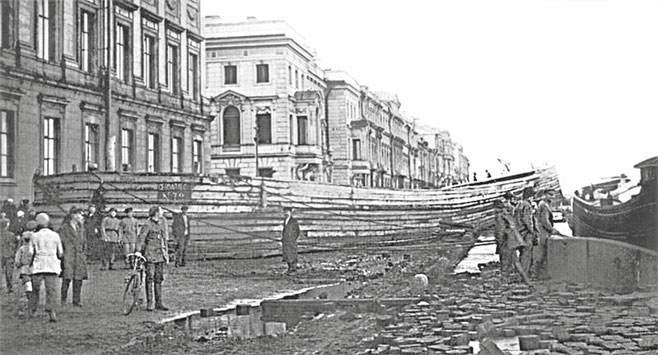 В 1924 г., спустя 100 лет после ужасного наводнения 1824 г., город подвергся новому наводнению, правда, не такому катастрофическому, но также принесшему немало бед. На этот раз вода поднялась на 380 см выше ординара при скорости ветра до 40–42 м/сек. Затопило более половины города, а глубина затопления местами достигала 2,5 м. В результате бедствия погибло до 600 человек, разрушено или повреждено 19 мостов. На Дворцовой набережной испорчено торцовое покрытие мостовой, а около Мраморного дворца на берег выбросило огромную барку.
